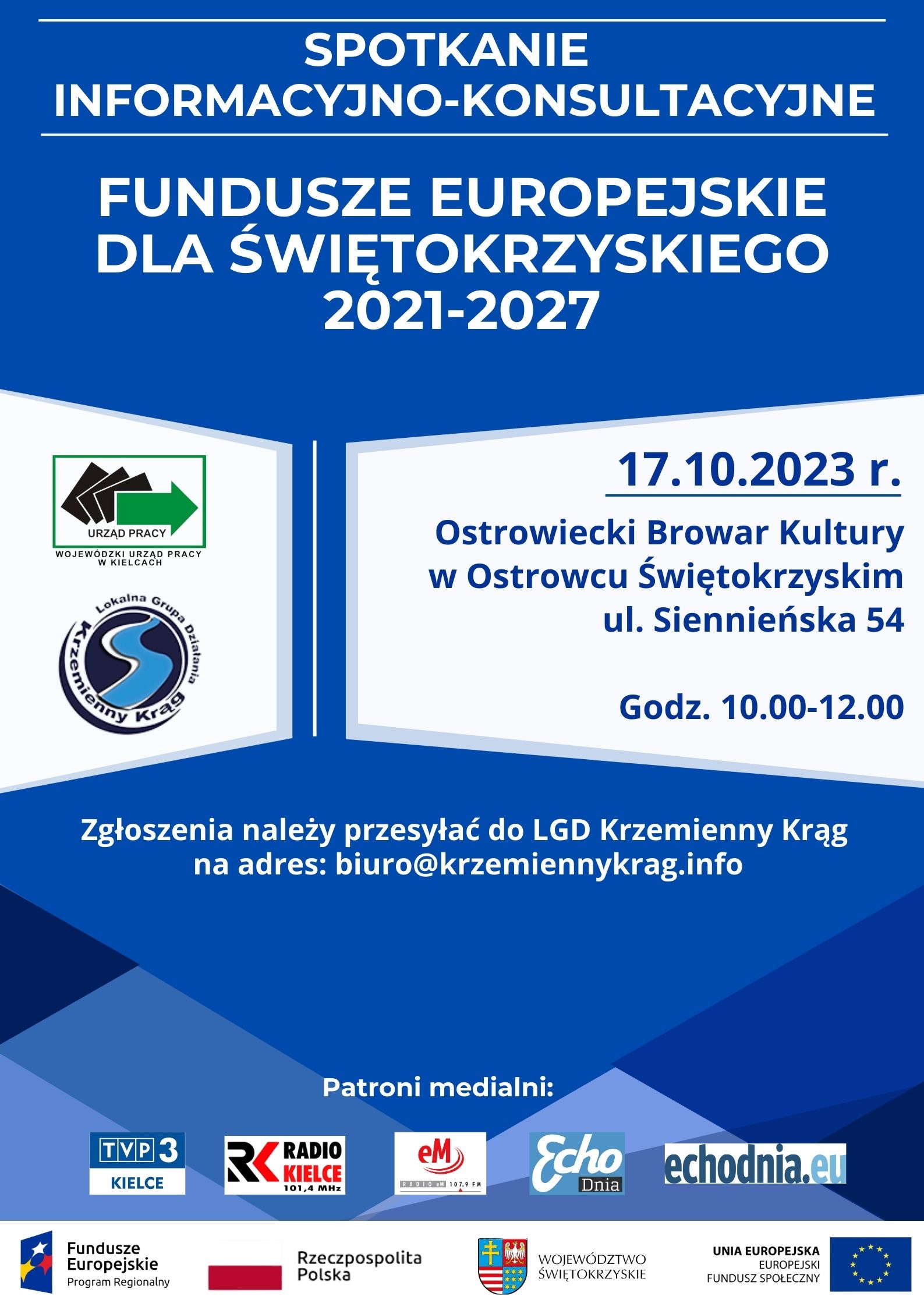 Stowarzyszenie Lokalna Grupa Działania „Krzemienny Krąg” oraz Wojewódzki Urząd Pracy serdecznie zapraszają pracodawców z terenu LGD na spotkanie pn. „Nowa perspektywa – nowe możliwości” promujące projekty w obszarze rynku pracy w ramach nowego programu regionalnego Fundusze Europejskie dla Świętokrzyskiego 2021-2027. Spotkanie odbędzie się 17 października 2023 r., o godz. 10:00 w Ostrowieckim Browarze Kultury, przy ul. Siennieńskiej 54.