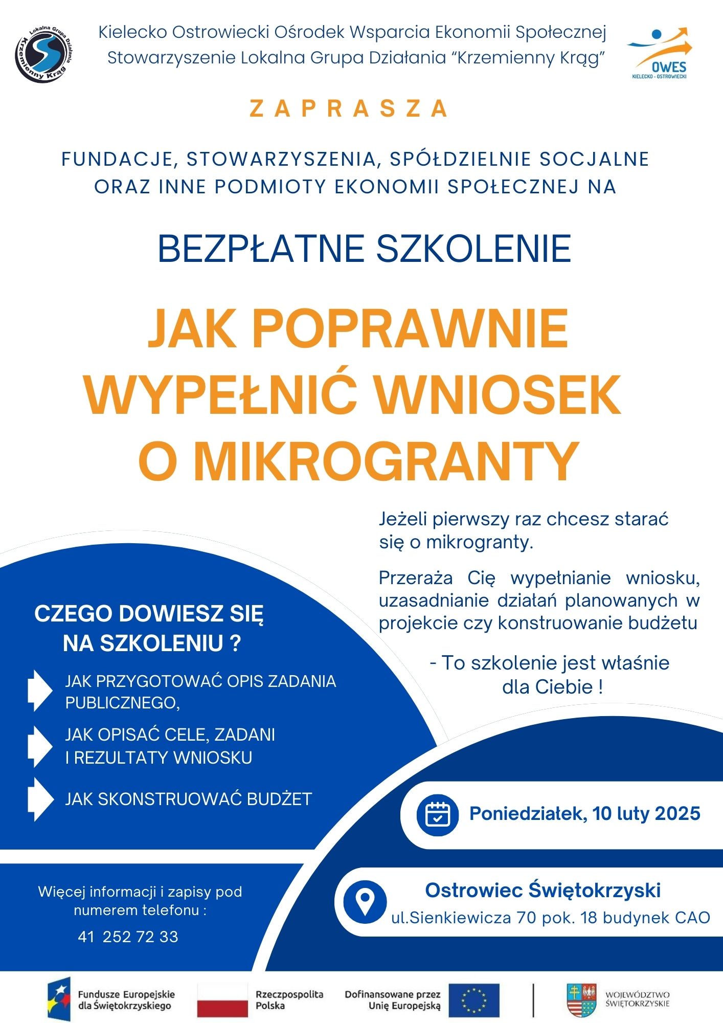 10.02.2025 r. w Ostrowcu Świętokrzyskim odbędzie się bezpłatne szkolenie pt. ” Jak prawidłowo wypełnić wniosek na mikrogrant”.