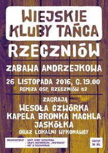 Zapraszamy na Zabawę Andrzejkową 26 listopada 2016r. o godz. 19:00 do Remizy OSP w Rzeczniowie. Zagrają: Wesoła Czwórka, Kapela Bronka Machla, Jaskółka Więcej
